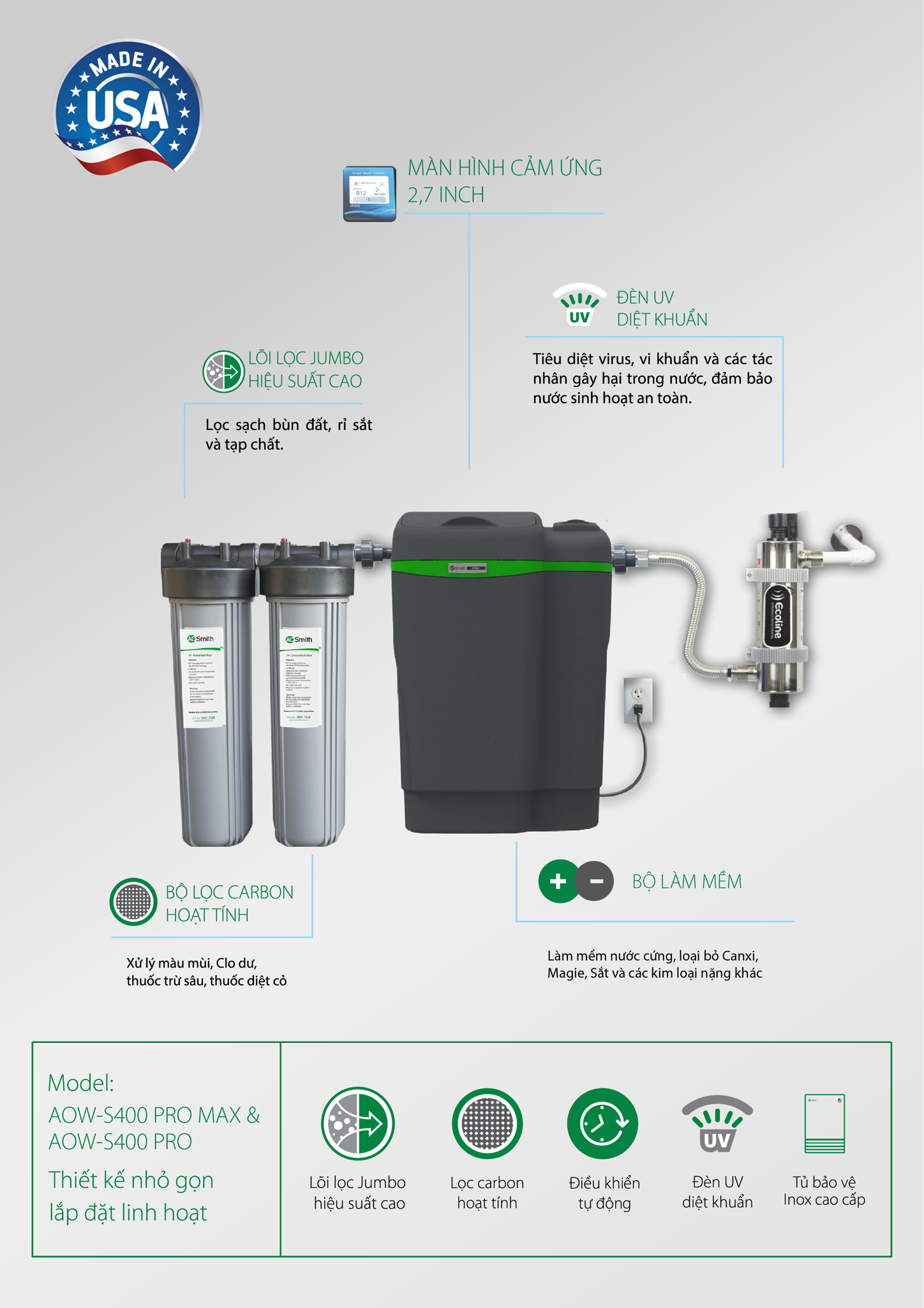 Bộ làm mềm nhập khẩu từ Mỹ, được chứng nhận bởi tổ chức NSF International theo tiêu chuẩn. NSF/ANSI 44 (Standard 44) của Hoa Kỳ, giúp loại bỏ phần lớn Canxi, Magie, bảo vệ các thiết bị vệ sinh và các thiết bị như máy giặt, bình nước nóng…